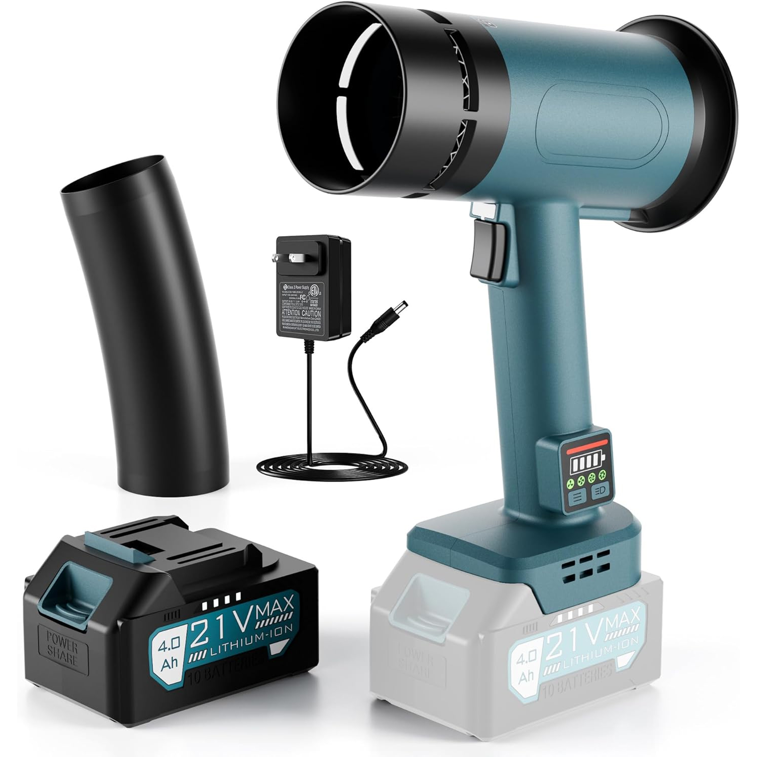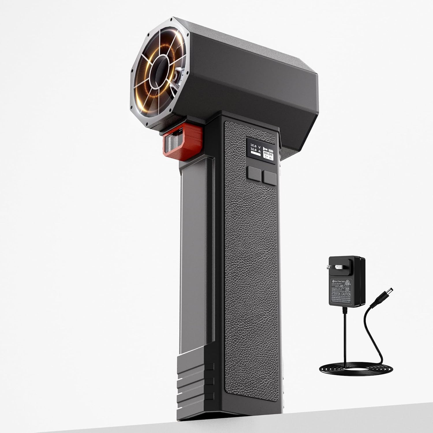 Equipped with LED lighting and an LCD display, this blower provides visibility and real-time performance metrics. The screen shows battery level, output power, and more, keeping users informed during use.