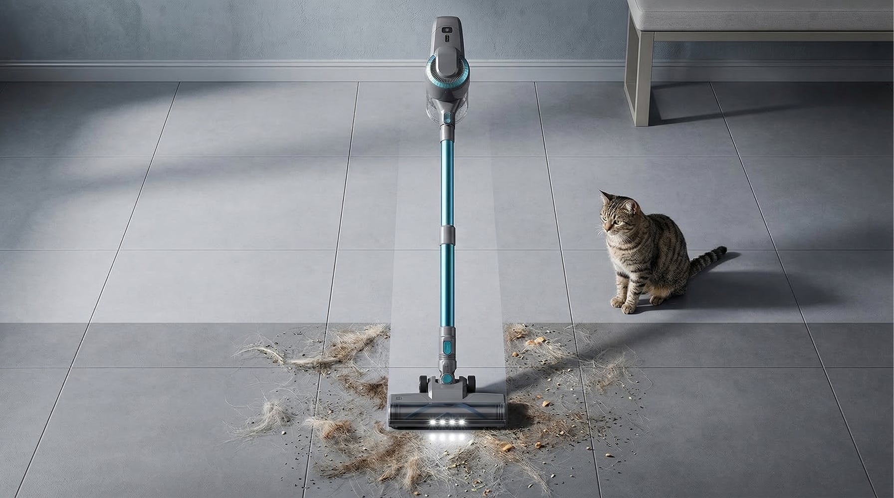 Visibility during cleaning is enhanced by the integrated LED cleaning lights located on the vacuum head. These lights effectively illuminate dust and debris in dark areas, such as under the bed or behind the sofa. The vacuum's profile is slightly bulkier, which might limit its ability to reach under very low furniture compared to more streamlined models.